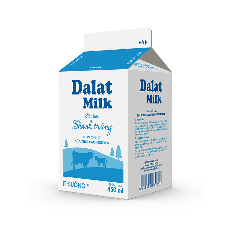 Sữa Tươi Thanh Trùng Dalatmilk chế biến từ 100% sữa bò tươi từ cao nguyên Lâm Đồng, nơi có điều kiện khí hậu trung bình từ 15 °C – 25 °C với độ cao trên 1000 m, phù hợp để cho ra nguồn sữa dinh dưỡng với chất lượng đồng nhất.